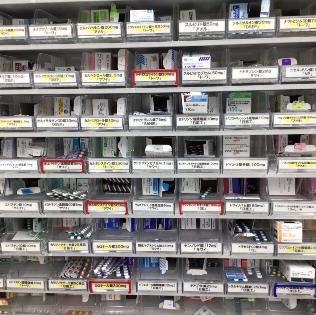 データ・ボックス薬局、バイアル調剤薬局の調剤室の医薬品棚を見られた方に他の薬局と比べて見やすくて綺麗とのお言葉を何度か頂きます。